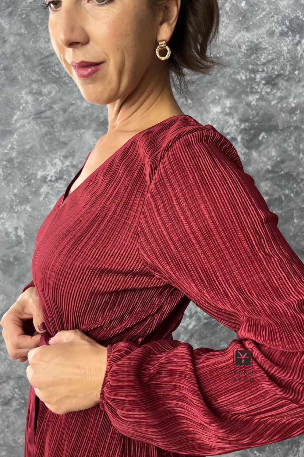 Ozdobený výstřih do V opticky prodlužuje krk a šíji. Saténový pásek v pase zdůrazňuje vyšší pas a dodává postavě ladný tvar, dá se podle příležitosti vyměnit za jiný a změnit tak styling. Díky jeho umístění šaty skvěle padnou, aniž by mačkaly na břicho. Dlouhé rukávy nabízí variabilitu, kdy je lze vytáhnout výš a vytvořit tak stylové 3/4 rukávy, což dodává šatům další rozměr.