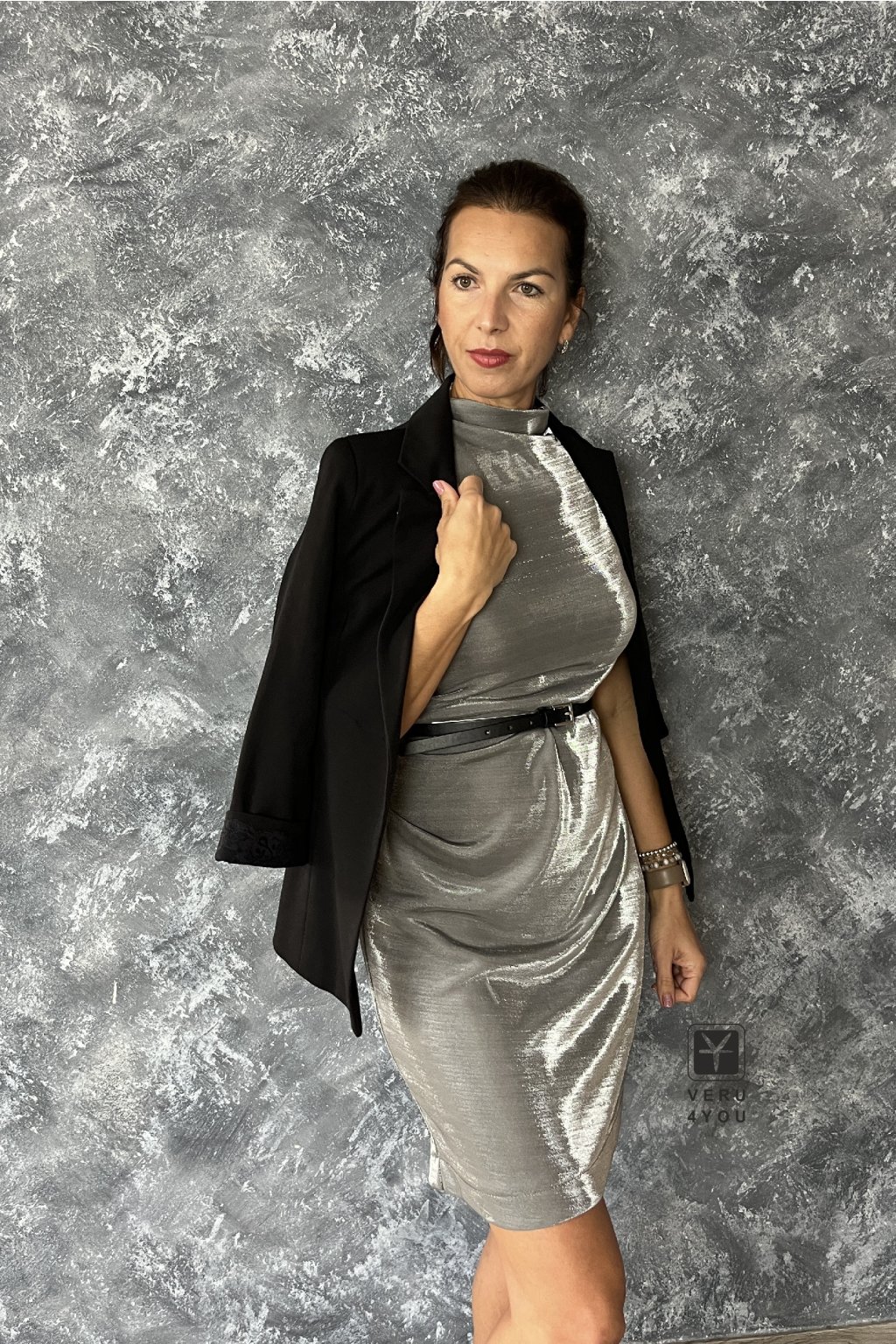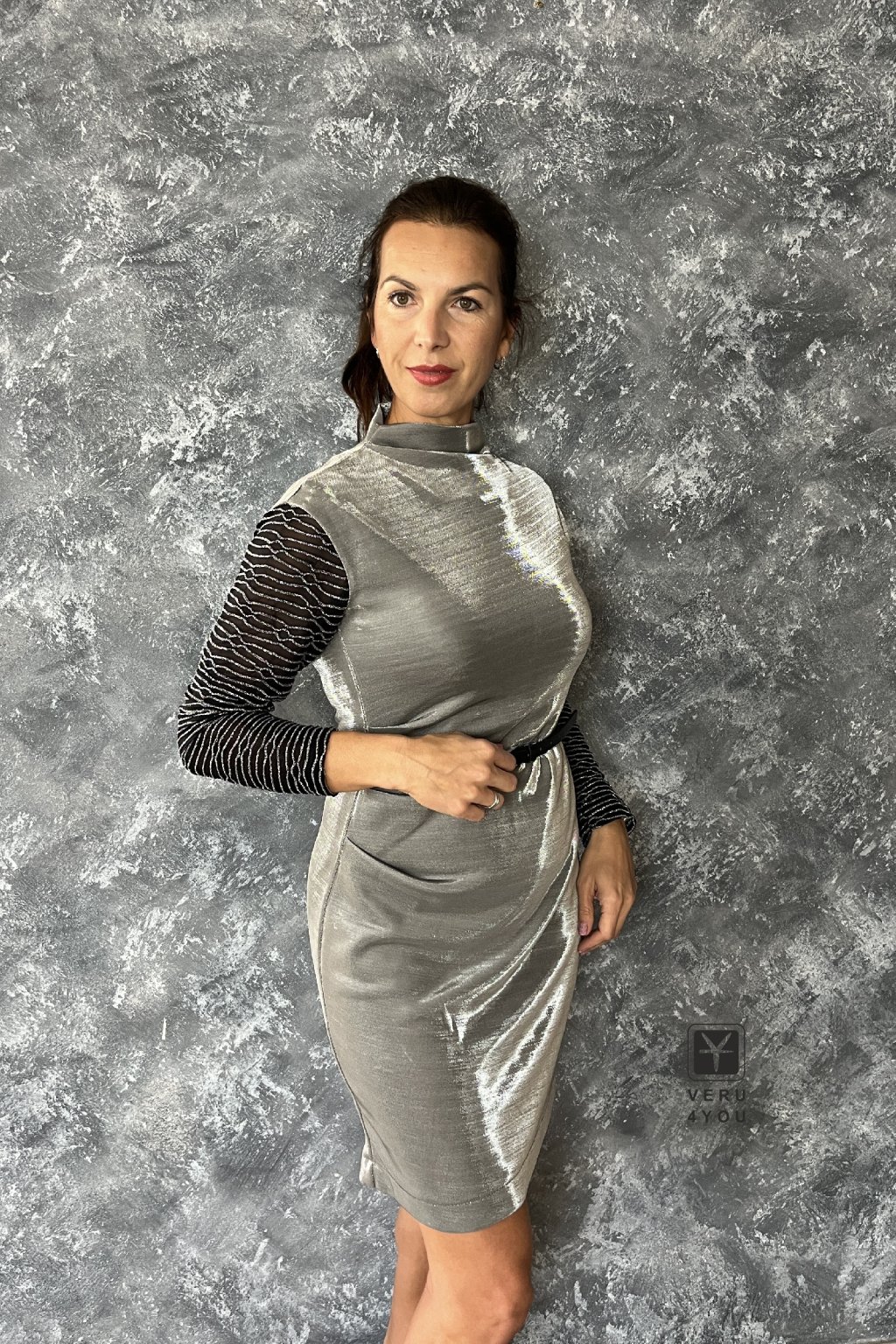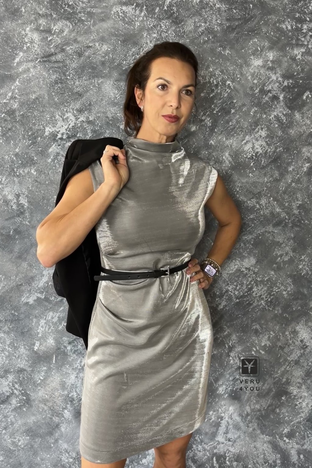 Pouzdrový střih, sklady v boku, stojáček, hodně elastický materiál, šedá barva se stříbrnými odlesky.