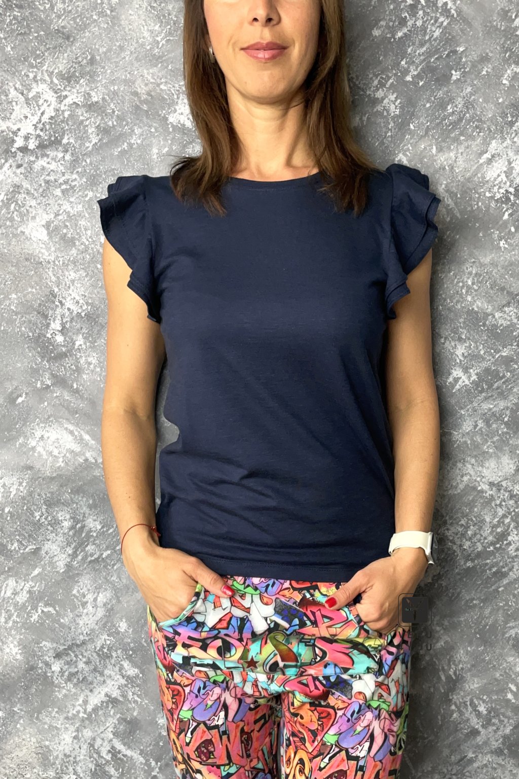 Modalovo-bavlněný úplet, žíhaný, rukáv ze dvou volánků, malý kulatý výstřih, na spodní délce saténová stružka s logem.