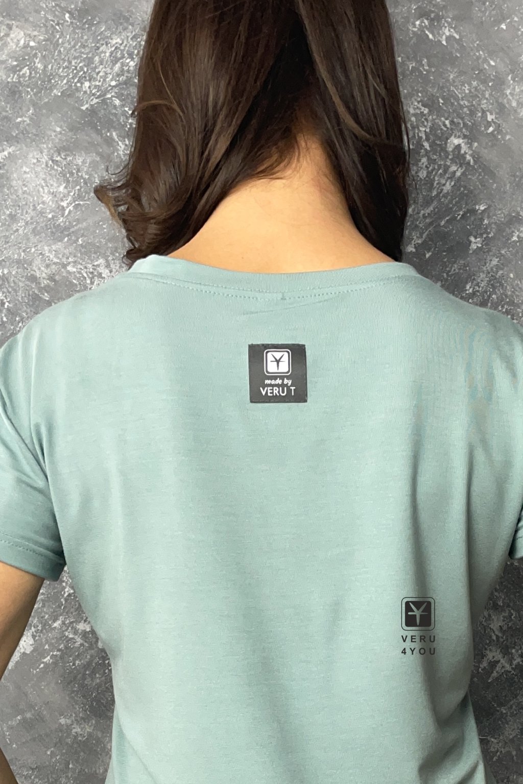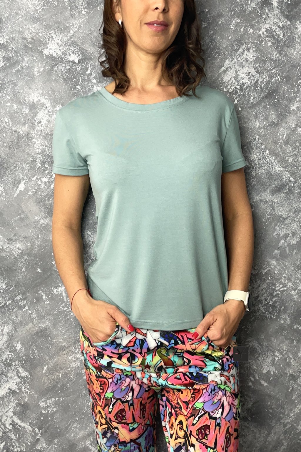 Modalový úplet, volnější , ale propasovany střih, krátky rukáv, kulatý lehce lodičkový výstřih, zadní díl s lehce prodlouženou délkou dokulata, na zadním díle za krkem výšivka s logem. .
